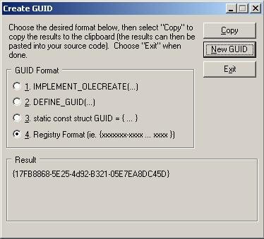 - Select Tools | Create GUID from the main menu to create a new GUID. The Create GUID dialog opens.